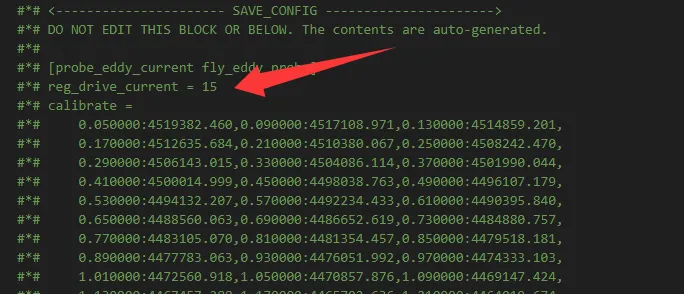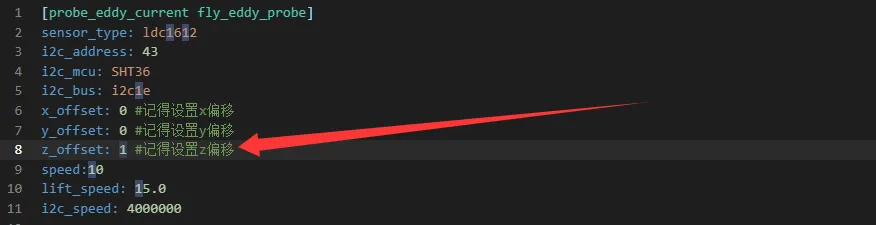 [probe_eddy_current fly_eddy_probe]中的z_offset:值改大,默认为1.0请修改为2.0或者2.5后保存并重启,然后测试。 - 提示:请不要重复配置