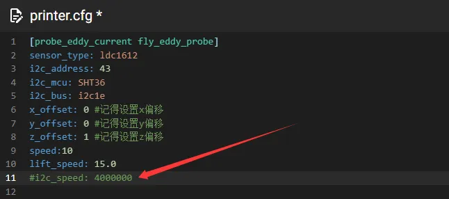 [probe_eddy_current fly_eddy_probe]中的i2c_speed: 4000000前面添加#进行屏蔽保存并重启,然后测试。 - 提示:屏蔽保存并重启后建议重新做校准。
