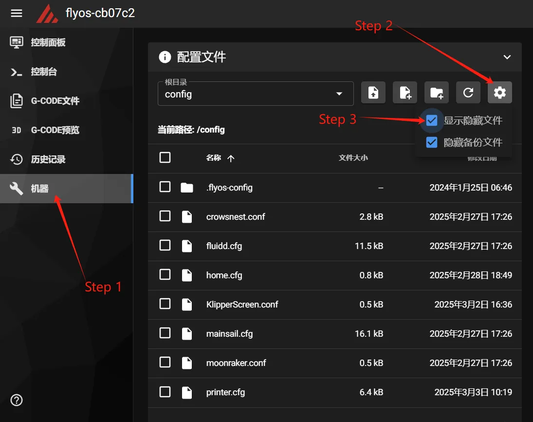 取消勾选->筛选隐藏的文件和文件夹。 - mainsail按下图右所示