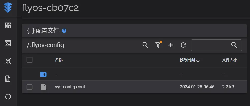 .flyos-config文件夹,进入这个文件夹会有sys-config.conf文件。 sys-config.conf文件就是可移动磁盘FlyOS-Conf中的配置文件config.txt的软链接。