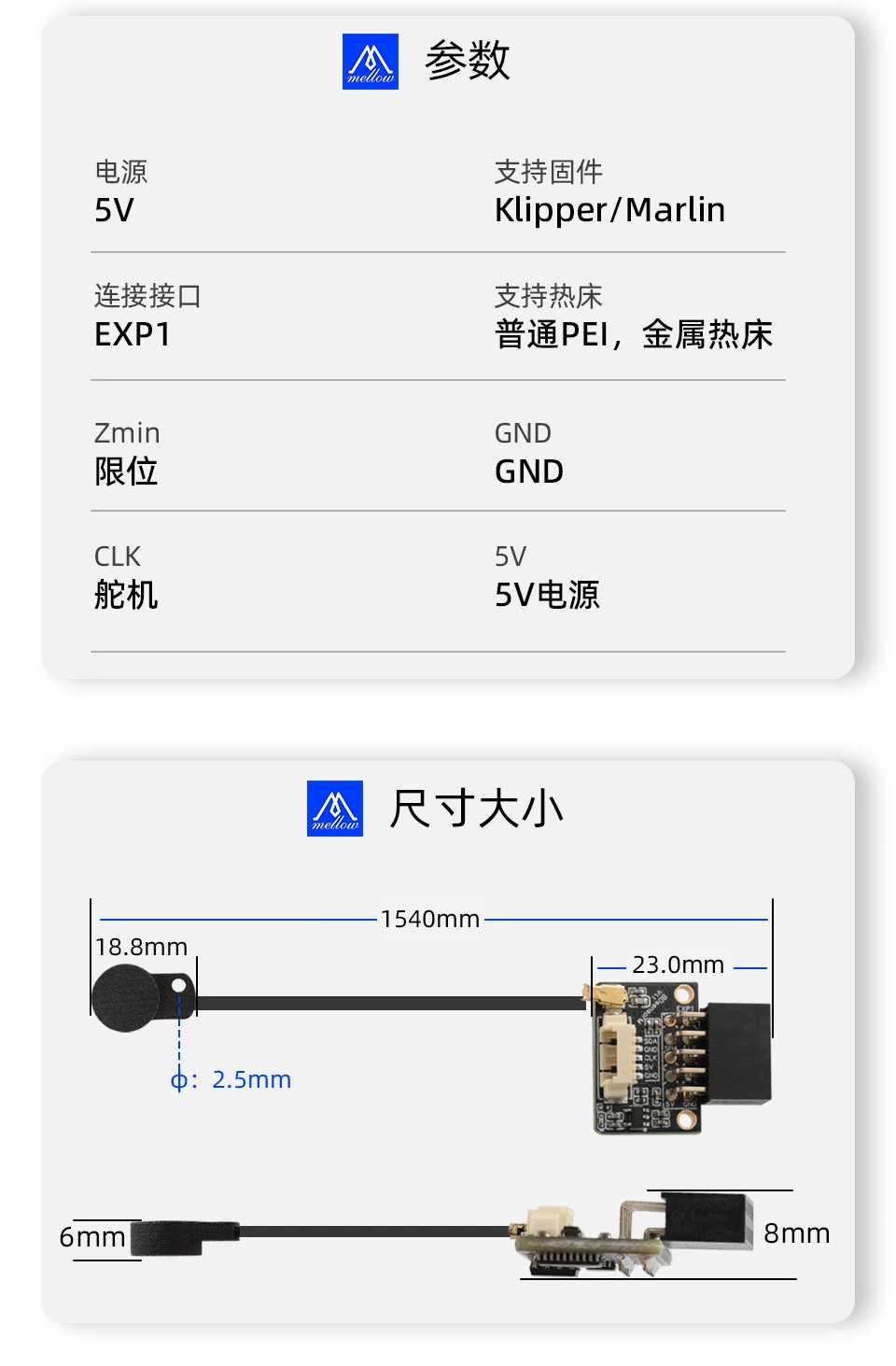 模块 & 扩展板类BDsensor-m安装指南本页总览提示 BDsensor-m可以直接使用主板的EXP1和*BL-TOUCH**接口 须知 请注意线序是否正确否则会损坏设备 BDsensor-m尺寸 线序分布 BDsensor-mBL-TOUCH功能介绍SDAZmin限位GNDGNDGNDSCLK舵机5V5V5V电源GNDGNDGND 安装示意图