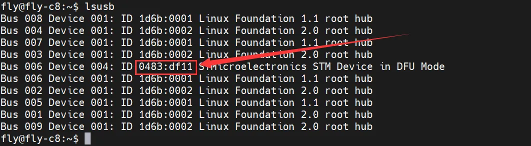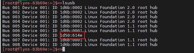 lsusb并且回车,如果出现下方图片中圈起来的信息,就可以进行下一步。- 如果没有任何信息反馈,这是上位机的系统问题,这边无能为力,你需要更换确定正常的系统或者更换上位机。