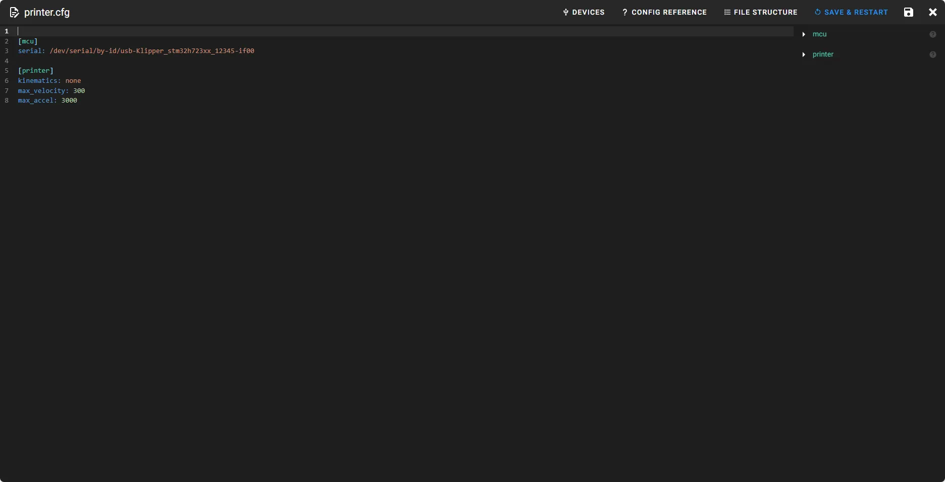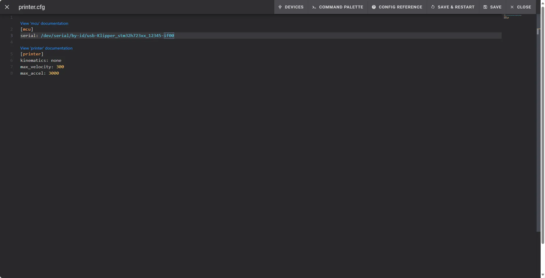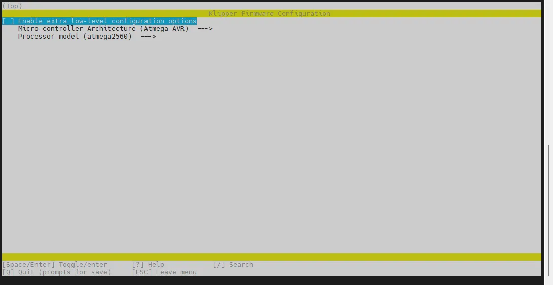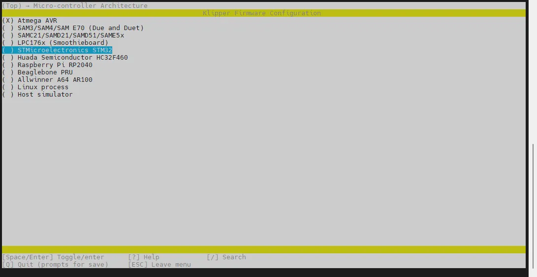 cd ~/klipper && rm -rf ~/klipper/.config && rm -rf ~/klipper/out && make menuconfig -