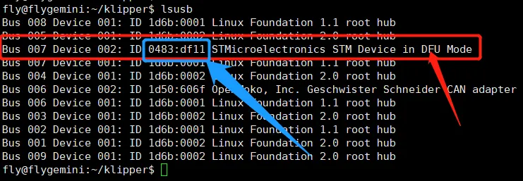 sudo dfu-util -a 0 -d 0483:df11 --dfuse-address 0x08000000 -D ~/klipper/out/klipper.bin