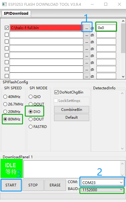 蓝色区域2选择Halo的串口(如果没有,可以按住Halo背面的B按键不放,然后再连接电脑) - 点击上图2中的