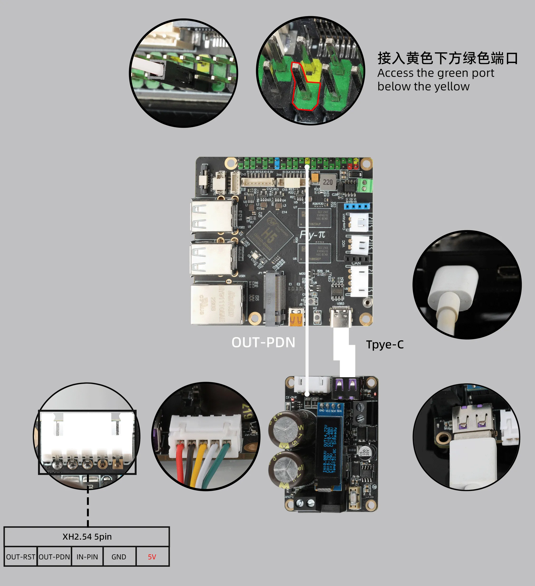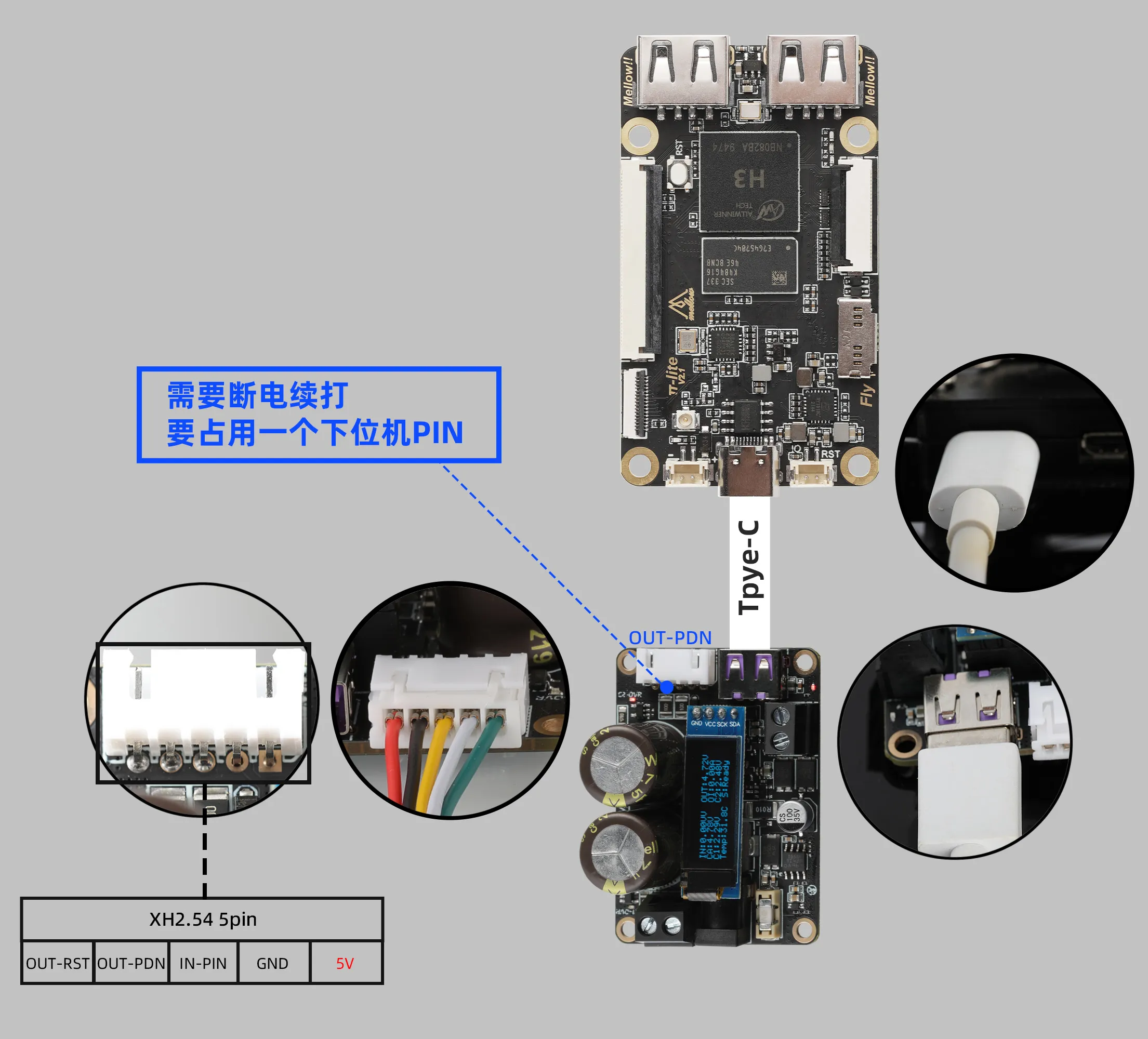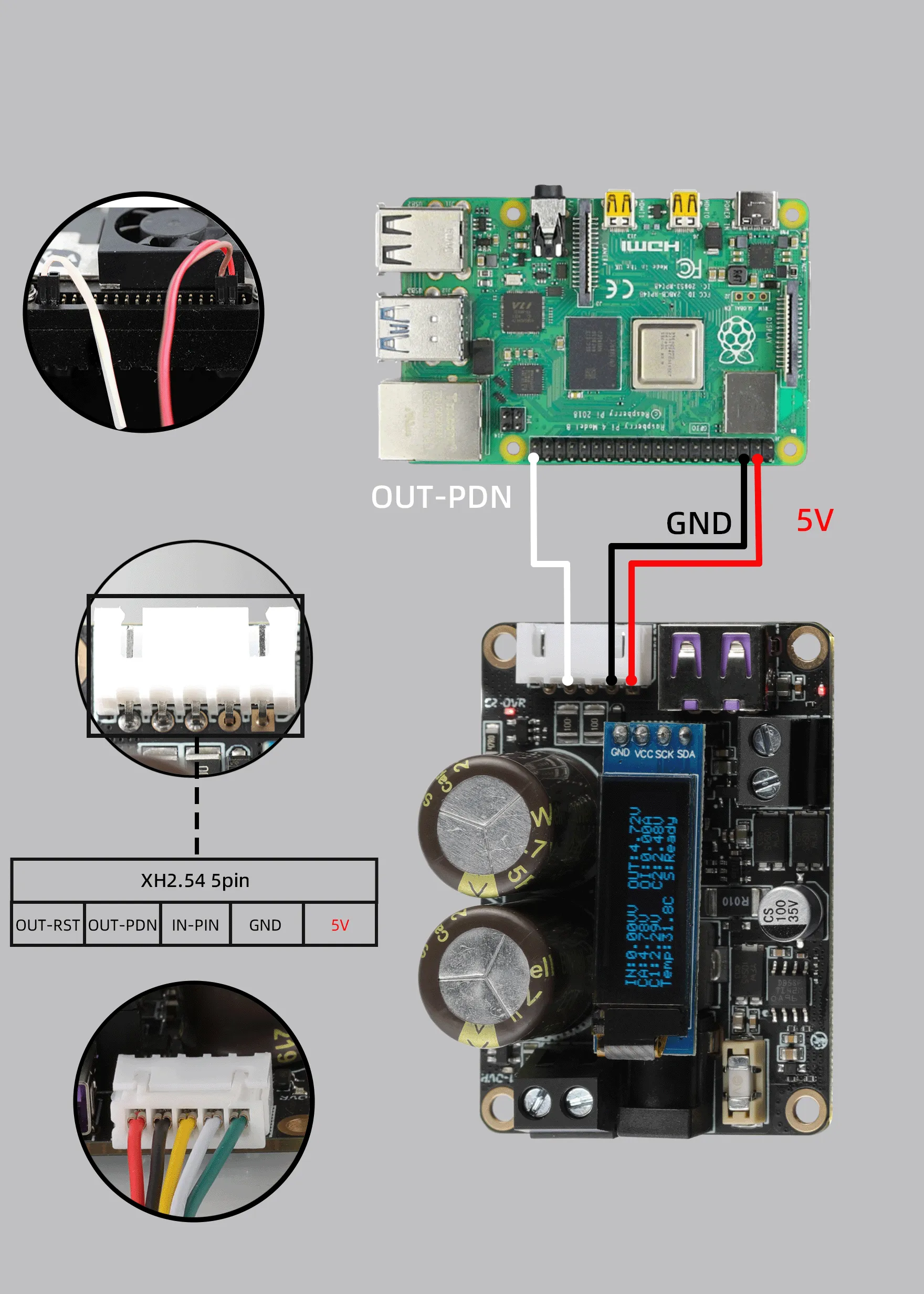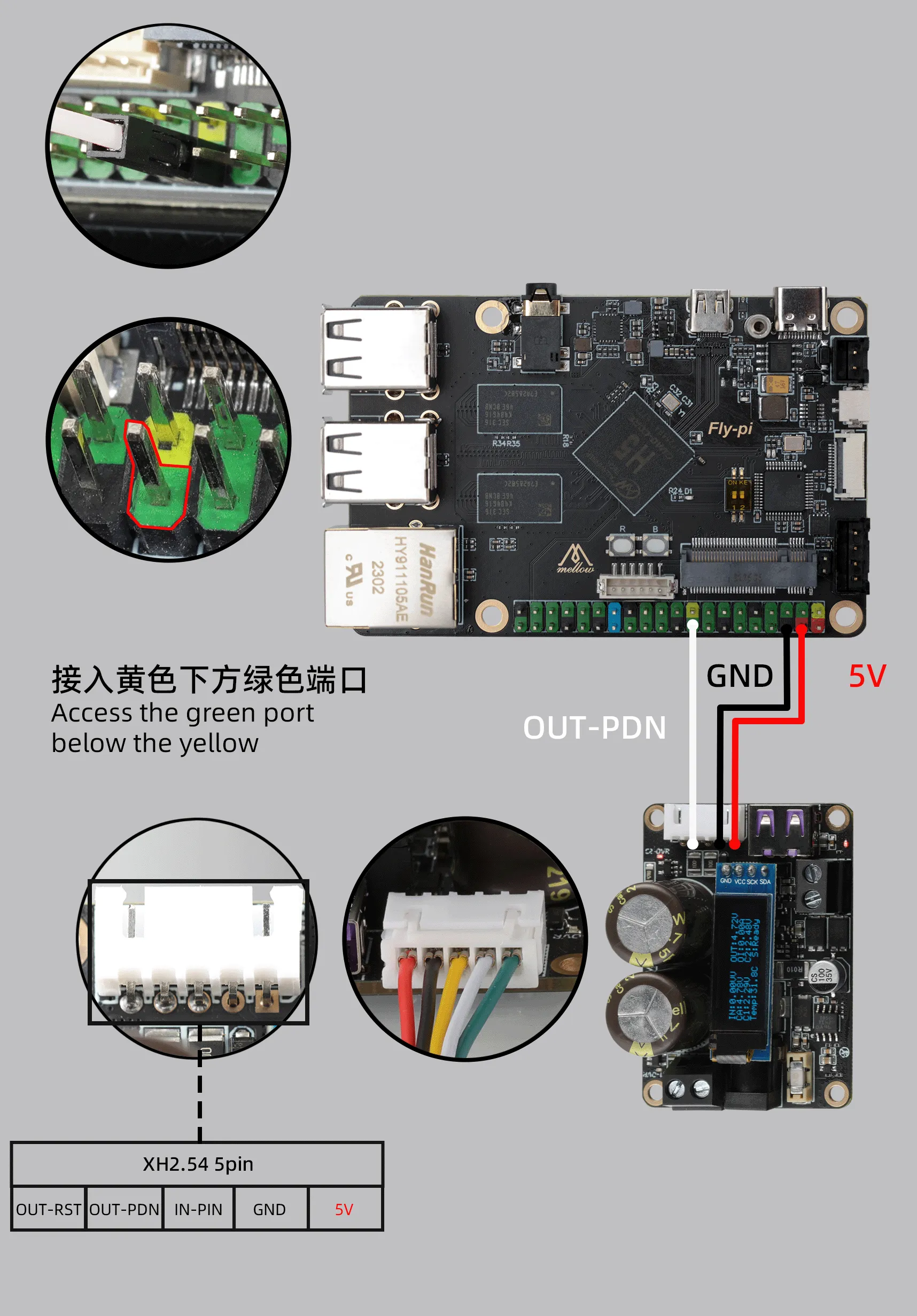 搭配安全关机模块时候,需要使用 12V-24V 电源供电,为确保模块工作正常,安全关机模块板内 5V 输出电压不能低于 4.9V,否则 安全关机模块 会从内部升压取电,电容会一直处于充电状态,导致模块持续发热
