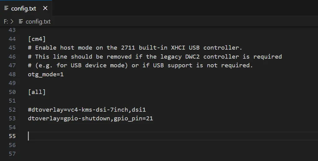 树莓派和上面操作类似,树莓派需要将装有系统镜像的 SD 卡插入电脑中,在config.txt文件中添加dtoverlay=gpio-shutdown,gpio_pin=21这一行命令,然后保存退出即可。