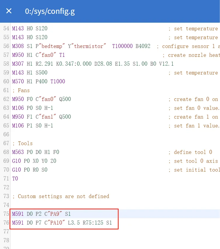 模块 & 扩展板类MDM-断堵料传感器 🔥RRF配置本页总览RRF配置 断料及堵料功能配置 打开RRF打印机网页界面,进入 Files -> System,找到 config.g 文件,点击打开编辑文件。 在文件中添加以下代码启用断料检测功能。 M591 D0 P2 C"PA9" S1 在文件中添加以下代码启用堵料检测功能。(L 参数根据所使用的码盘而改变,如果出现误触发请适当增大此值) M591 D0 P7 C"PA10" L3.5 R75:125 S1