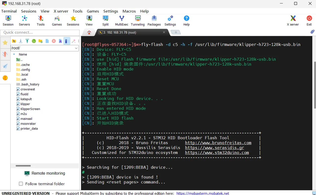 fly-flash -d c5 -h -f /usr/lib/firmware/klipper-h723-128k-usb.bin