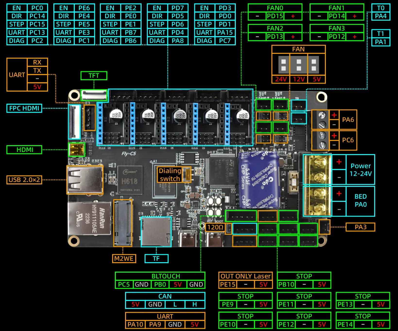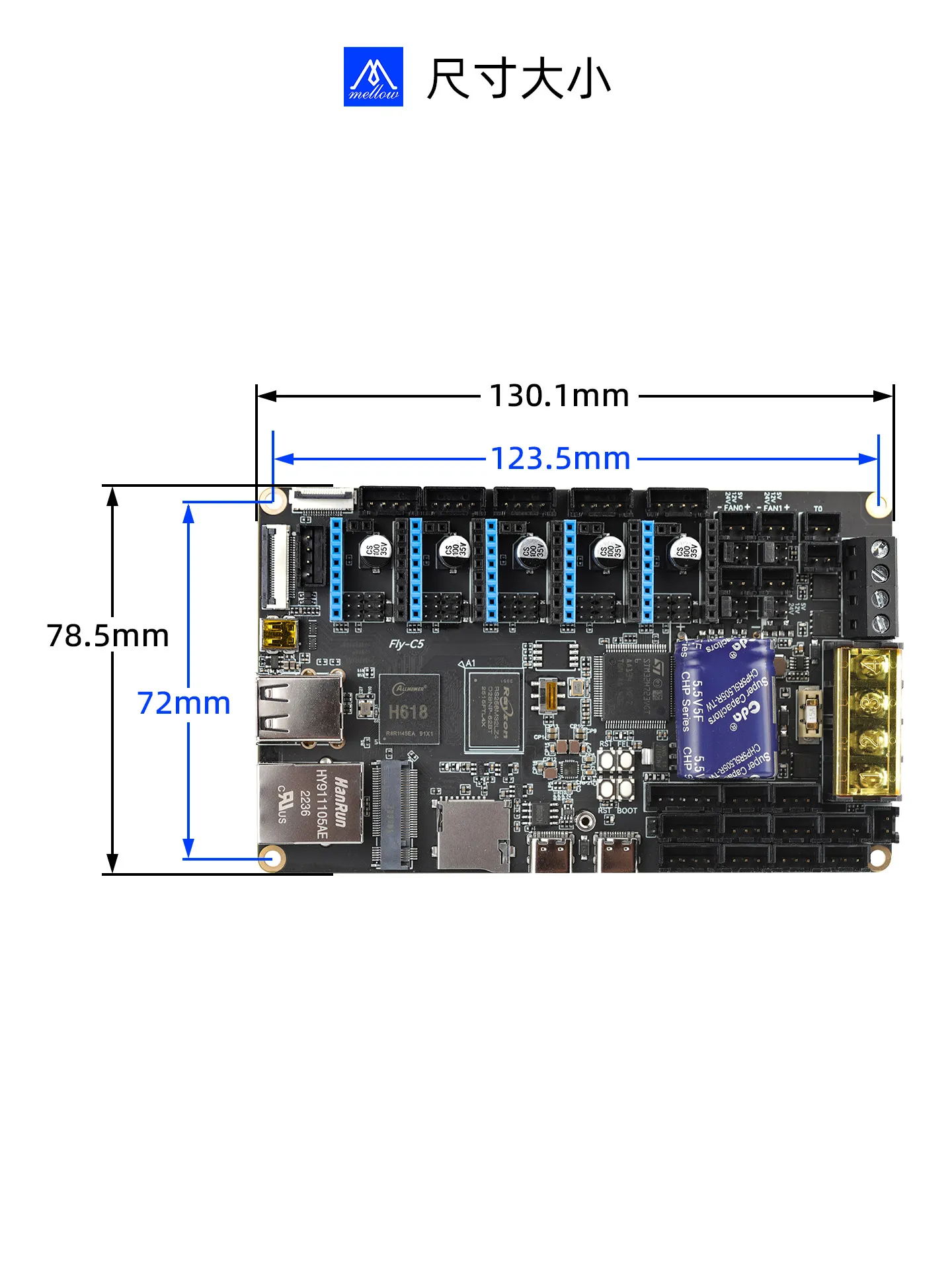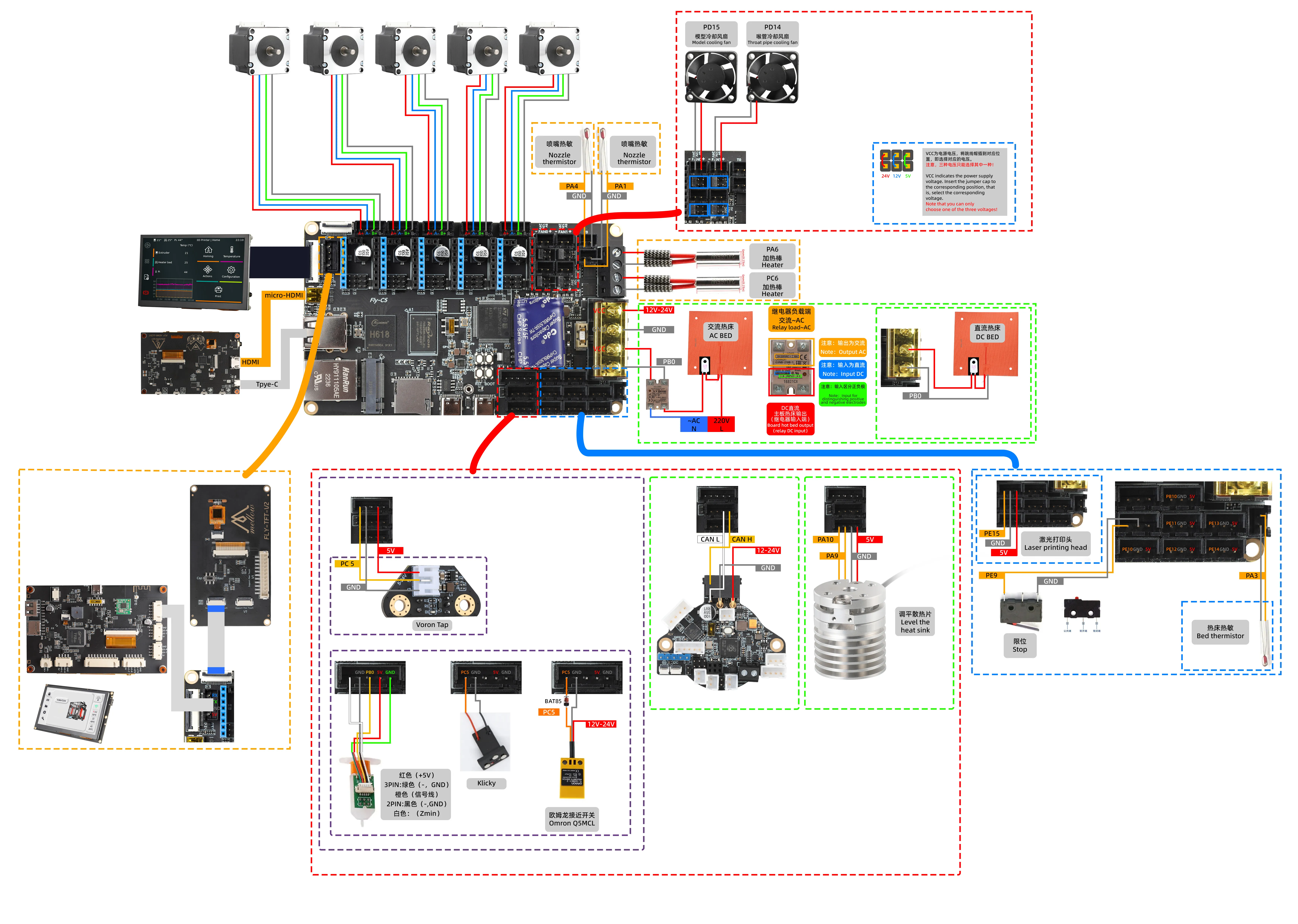 主板类FLY-C 系列主板FLY-C5主板接线本页总览接线参考 接口说明 如有会提供 PIN脚说明 驱动跳线说明 主板接线 警告请勿使用购买的成品三线限位开关,此类限位开关可能会使主板短路,损坏主板!请严格按照接线图中所示的接线方式接线! 尺寸图