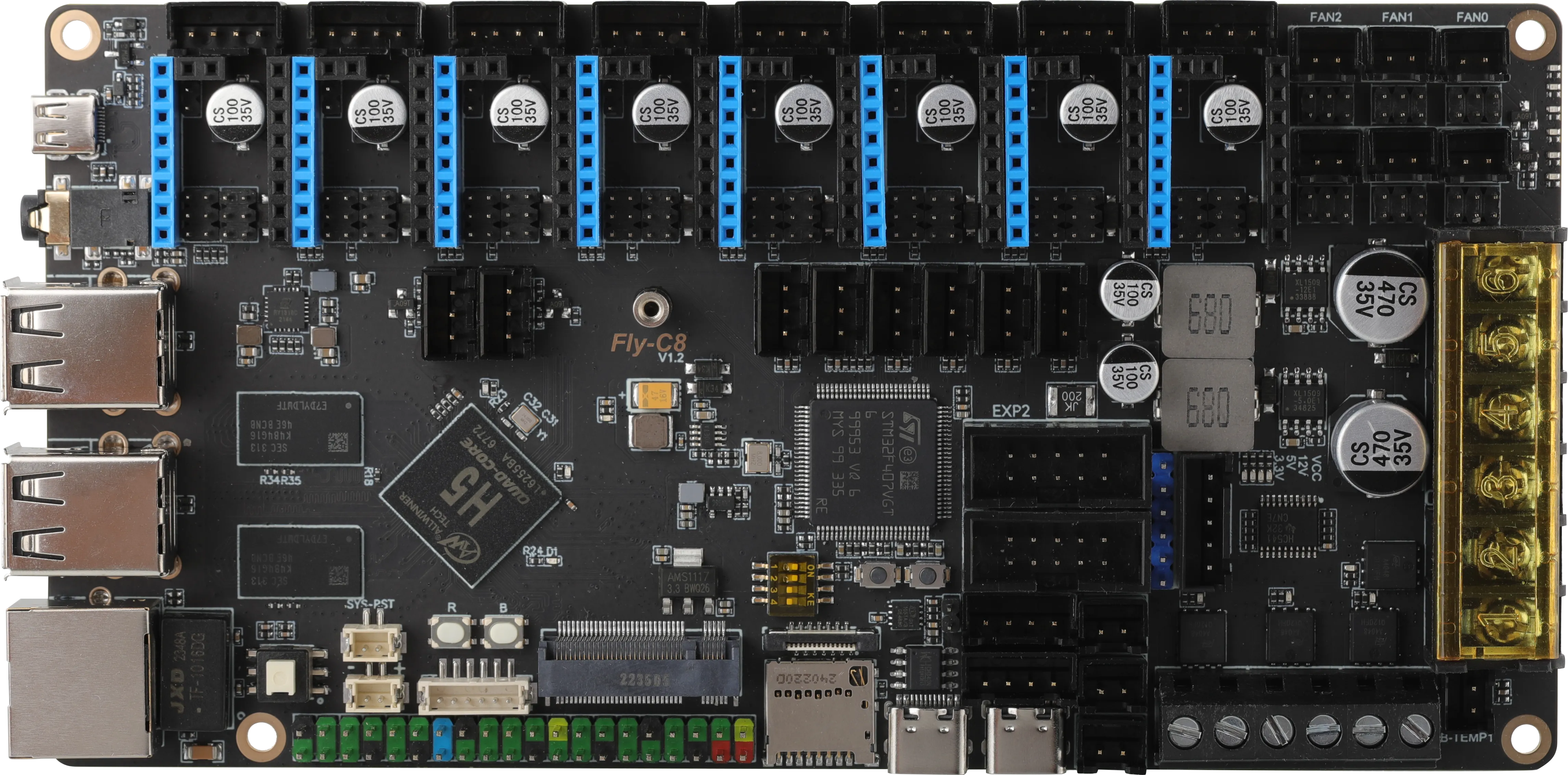 • 系统预装klipper、moonraker、mainsail、fulidd、klipper-screen、Crowsmest、共振补偿插件 numpy与FLY-Tools,无需换源等复杂的操作,小白更容易上手(需要购买TF卡或者M2WE)
