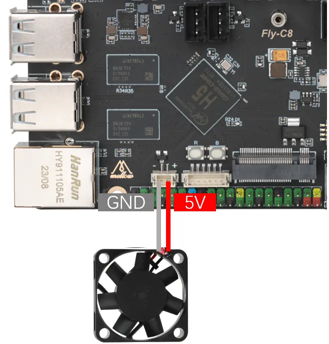 C8板载了一个5V的可控接口,用于主控散热,接线方法如下图