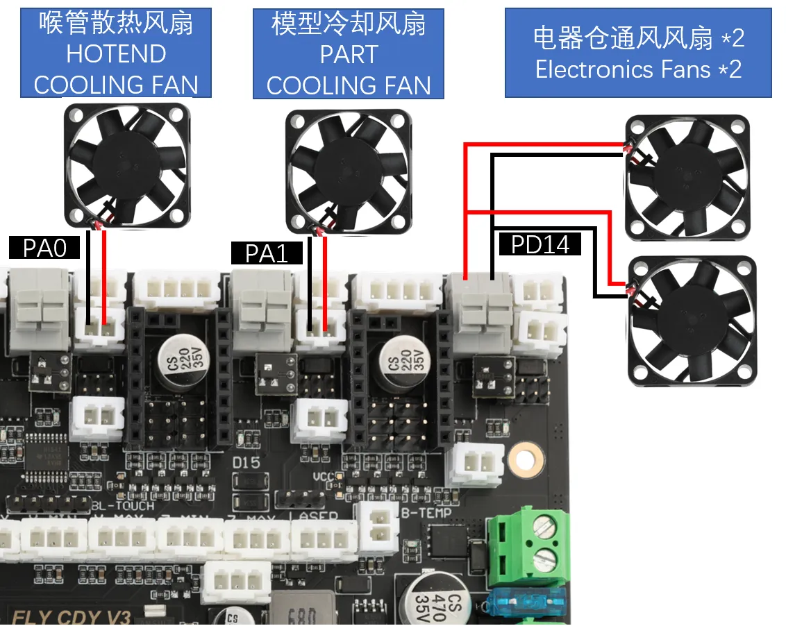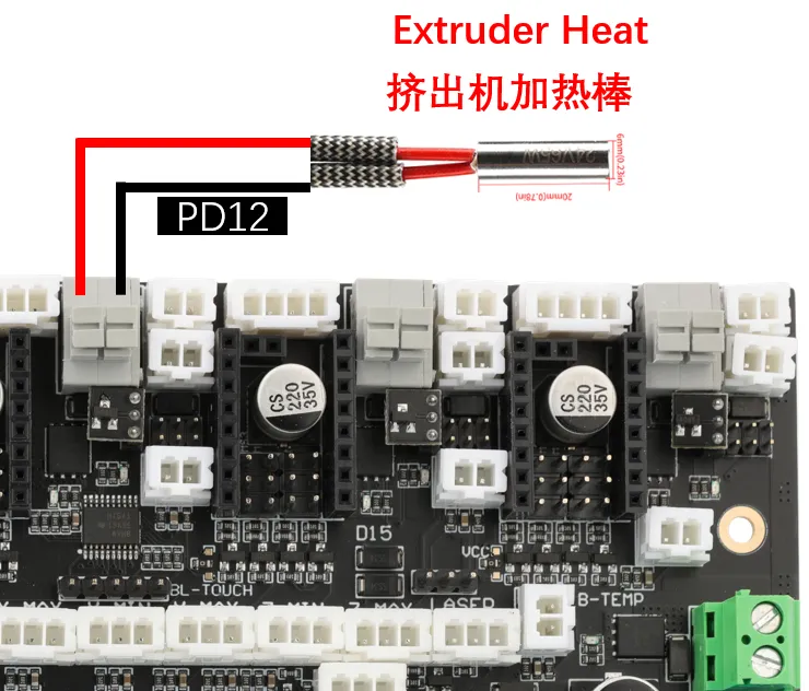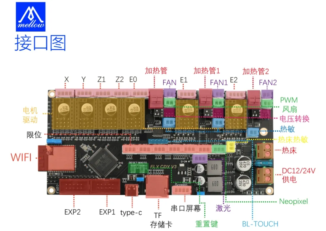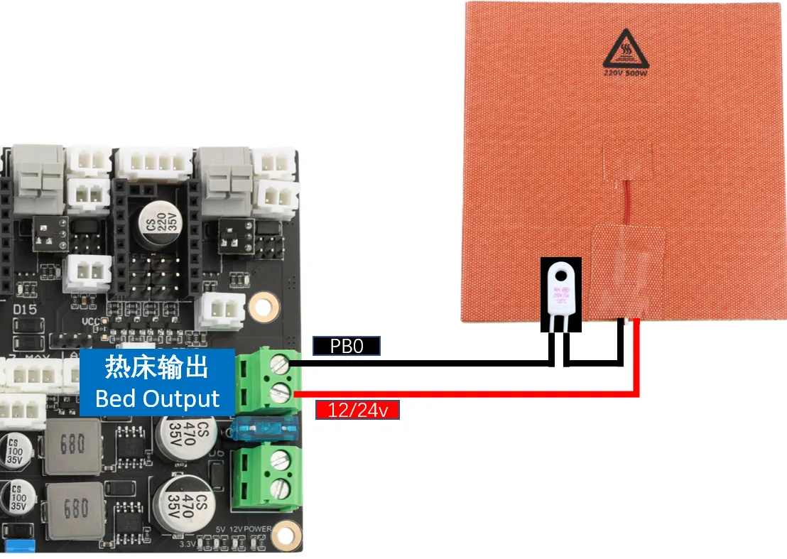 直流热床: 板载MOS接直流热床时请注意使用功率,直流热床最大电流不能超过10A。如果超过10A,建议使用外接MOS模块来使用热床,否则可能会对主板造成不可逆的损伤。