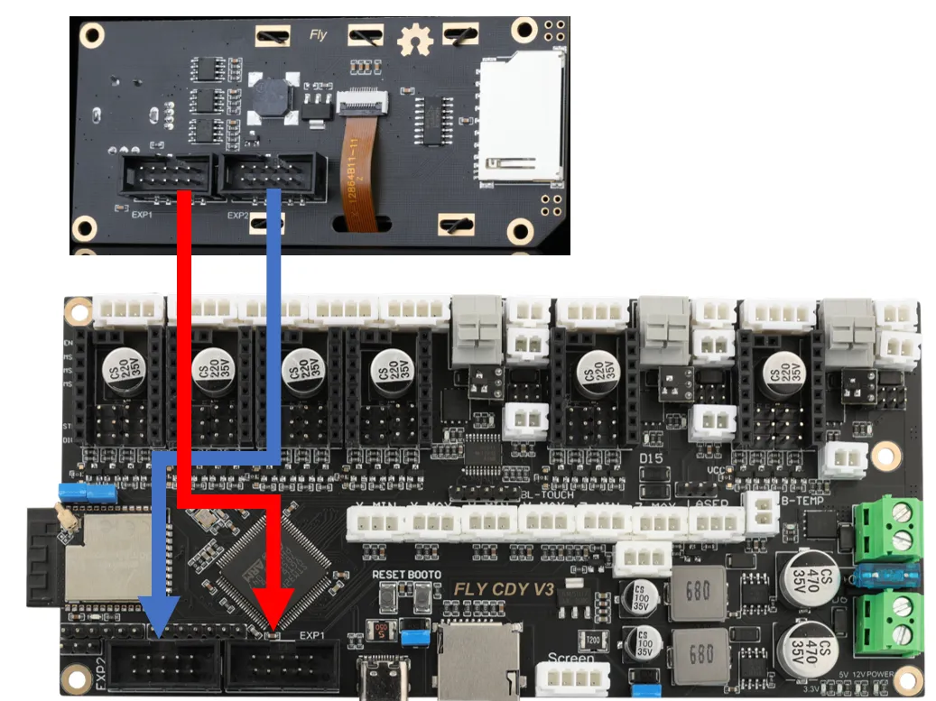 下图为FLY的mini12864的接线方式,其他厂家的屏幕请咨询相应厂家。Mini12864屏幕接接反,接错可能会导致上位机连不上MCU。如果使用mini12864屏幕之前可以正常连上主板的MCU,而使用mini12864后就连不上MCU了,请尝试拔出mini12864的接线!!!