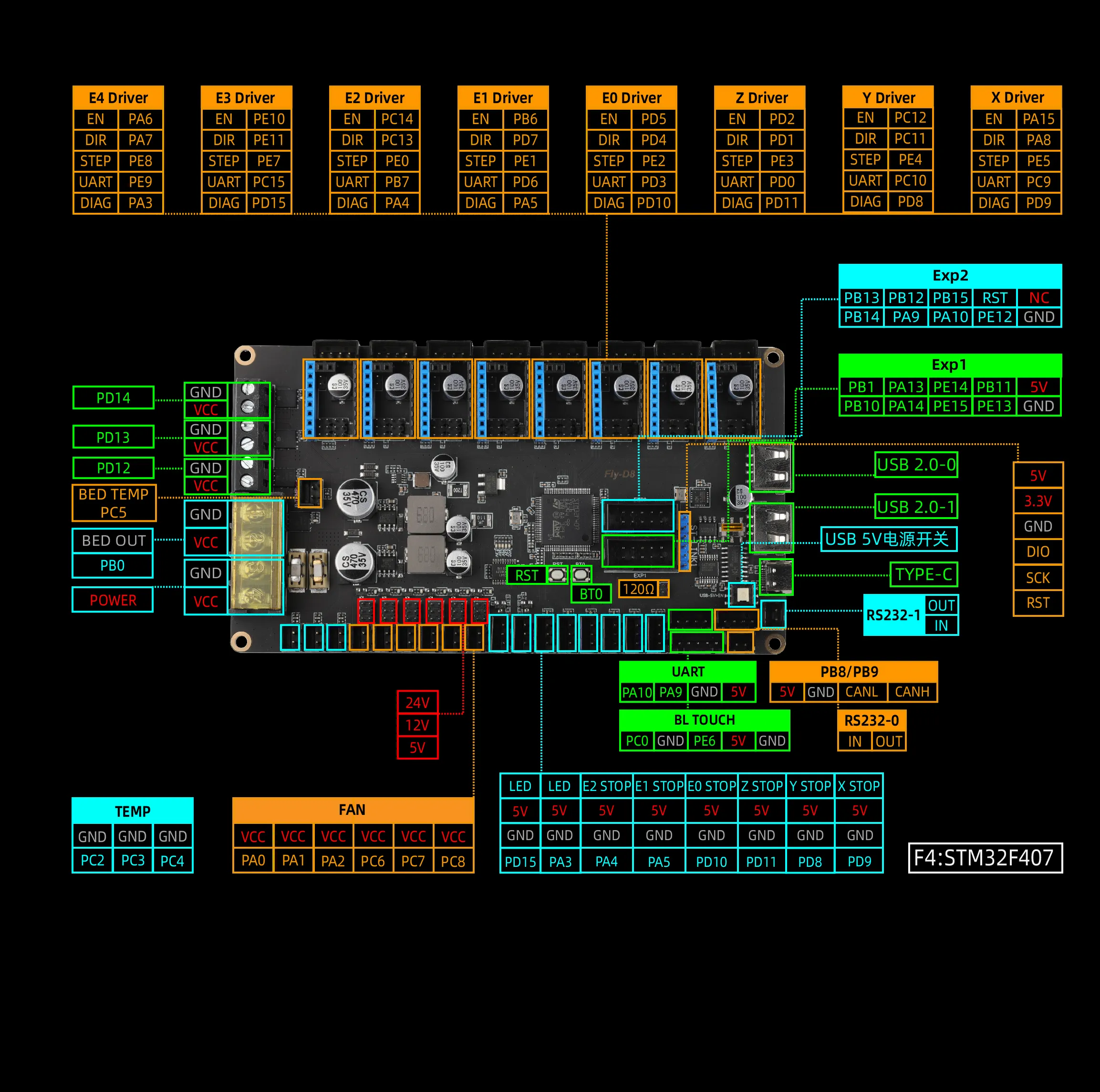主板类FLY-D 系列主板FLY-D8 (F407)接线参考本页总览接线参考 PIN脚说明 主板驱动跳线 主板接线 警告请勿使用购买的成品三线限位开关,此类限位开关可能会使主板短路,损坏主板!!!请严格按照接线图中所示的接线方式接线!!!