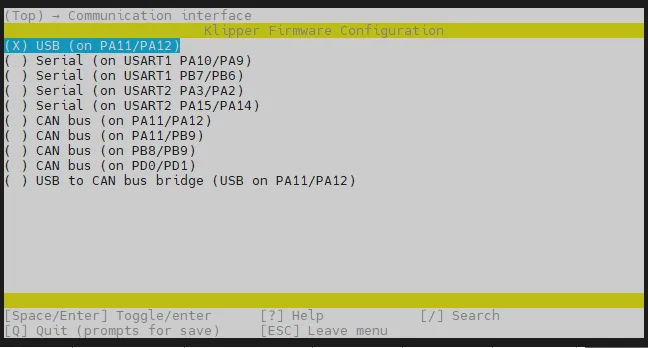 cd ~/klipper && rm -rf ~/klipper/.config && rm -rf ~/klipper/out && make menuconfig -