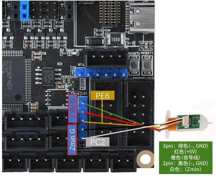 BL-touch一共有五根线,三根为第一组,负责传感器的供电和探针的收放,第二组为地线和信号线,输出限位信号。BL-touch接线时请仔细核对线序,错误的接线可能会永久性损坏传感器和主板!!!接线方法如下图所示。