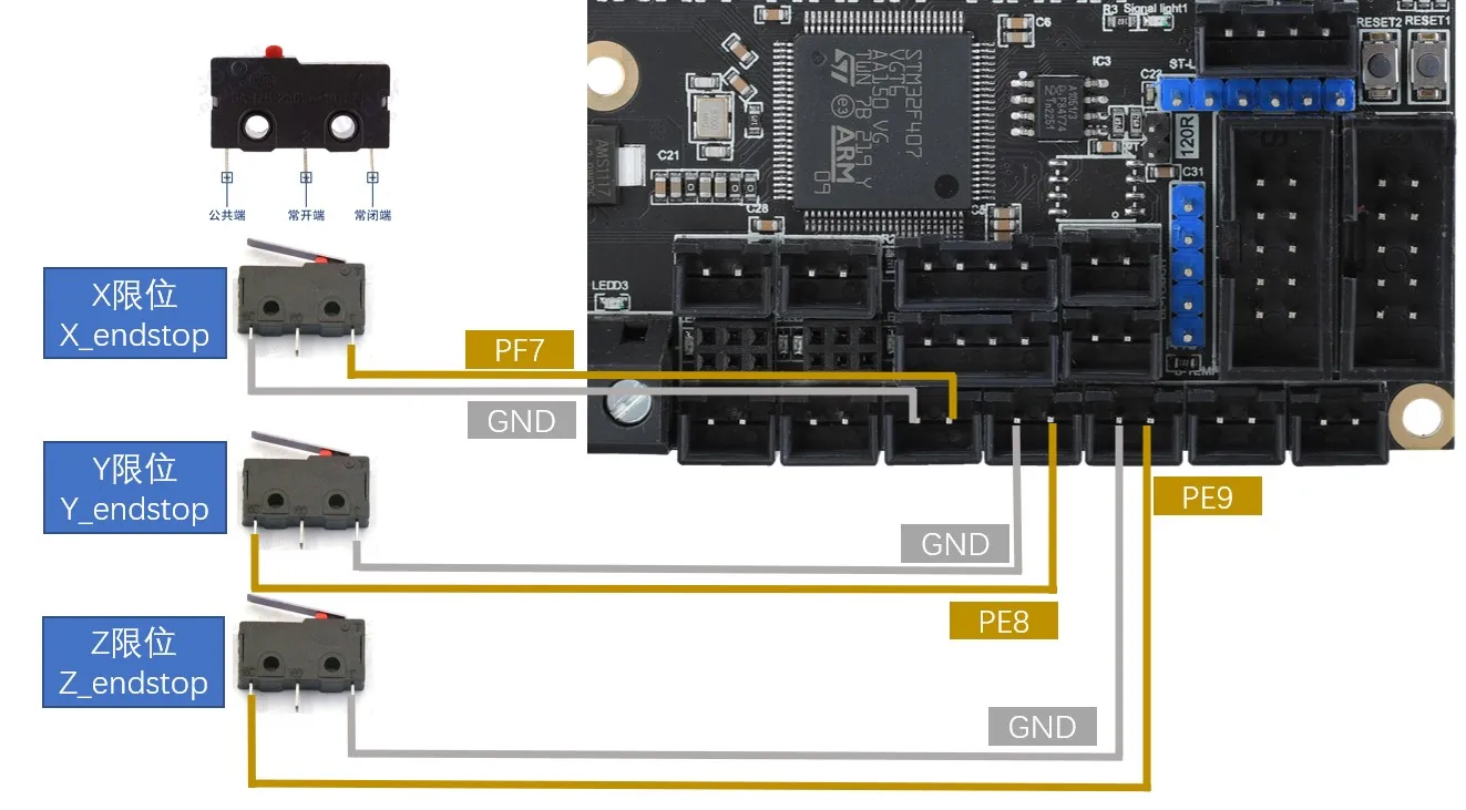 限位开关有常开(NO)和常闭(NC)两种。一般在3D打印机上,建议使用常闭(NC),这样在限位开关线路出现问题时,系统会及时报错,可以避免一些不必要的撞车,避免损坏打印机。