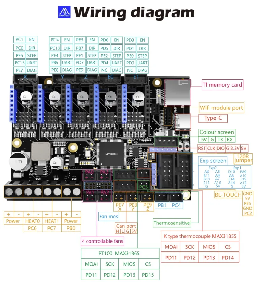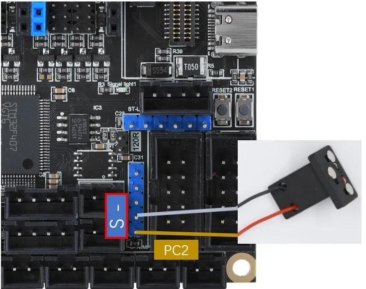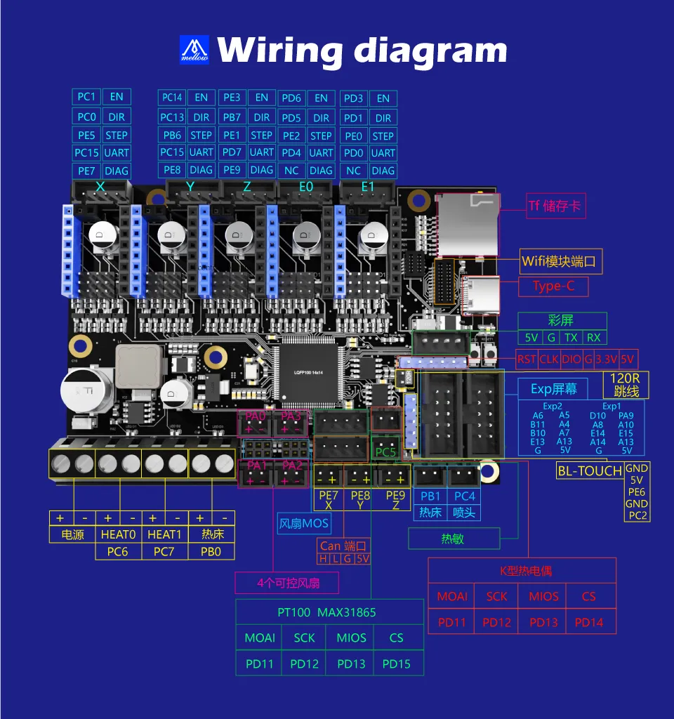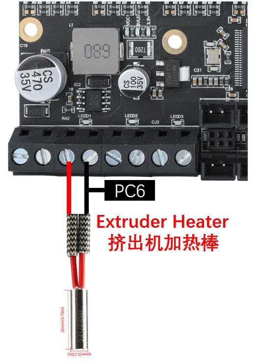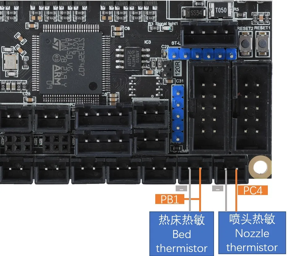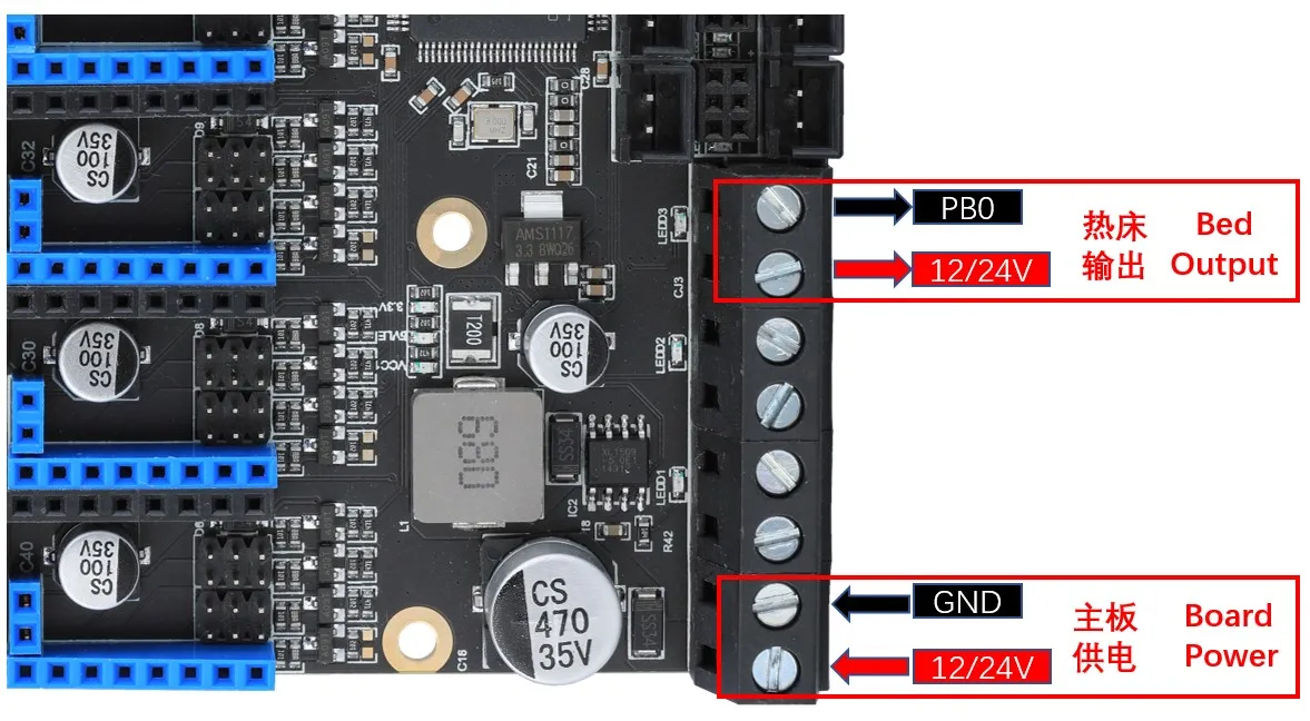 直流热床: 板载MOS接直流热床时请注意使用功率,直流热床最大电流不能超过10A。如果超过10A,建议使用外接MOS模块来使用热床,否则可能会对主板造成不可逆的损伤。
