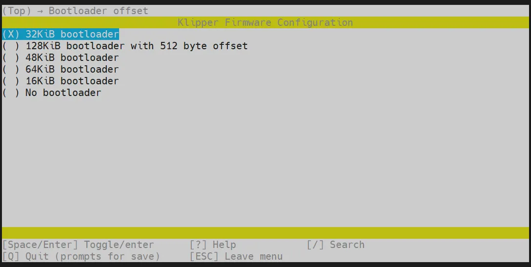 ESC,用于返回上一级菜单 Q键,用于退出Klipper固件配置页面Y键,在退出Klipper固件配置页面时,如果有提示,则点击Y键保存配置文件