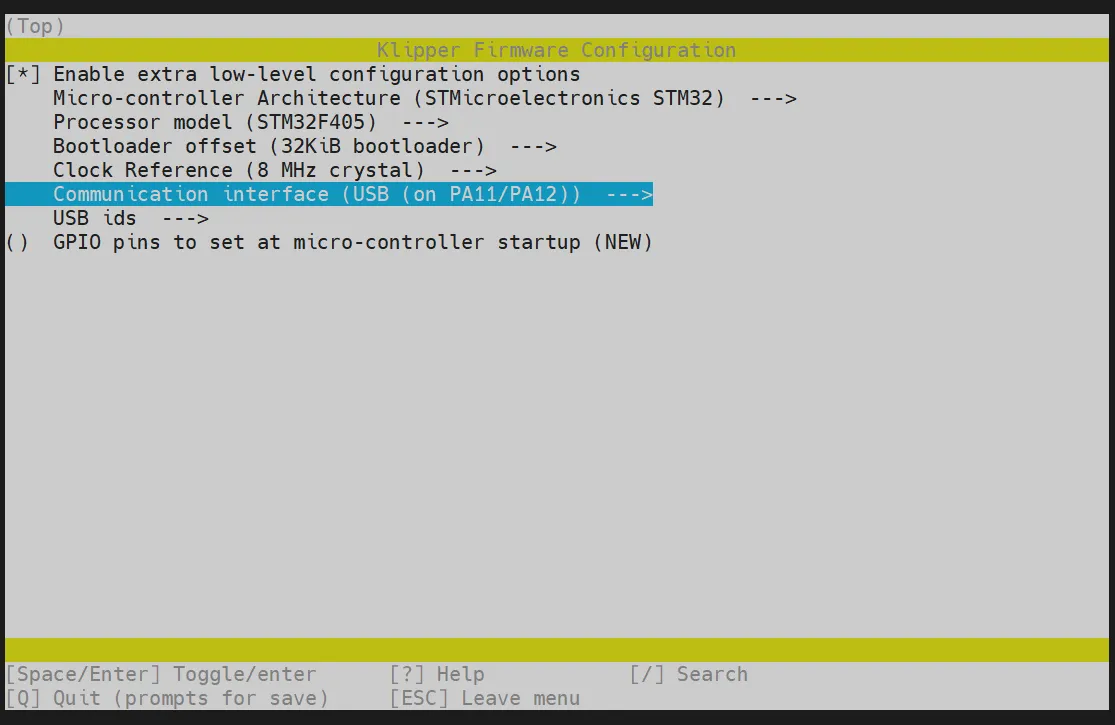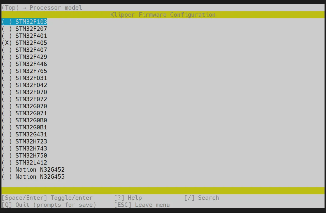 cd ~/klipper && rm -rf ~/klipper/.config && rm -rf ~/klipper/out && make menuconfig -