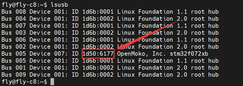 lsusb指令能够显示设备,但是没有1d50:6177,请尝试更换数据线,尝试将主板连接到上位机的其他USB口。