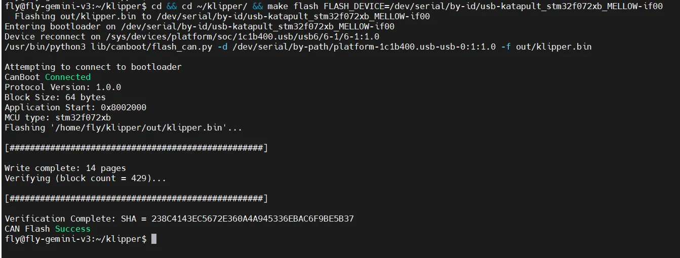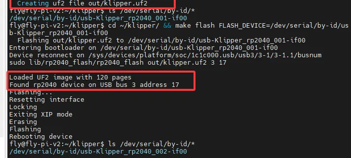 <你的主板ID>替换为上一步查询到的IDcd ~/klipper/ && make flash FLASH_DEVICE=<你的主板ID>