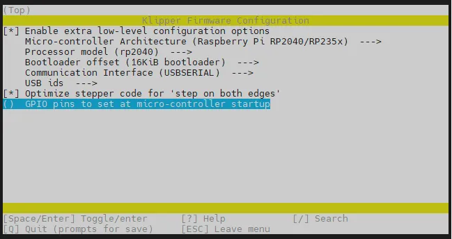 cd ~/klipper && rm -rf ~/klipper/.config && rm -rf ~/klipper/out && make menuconfig -