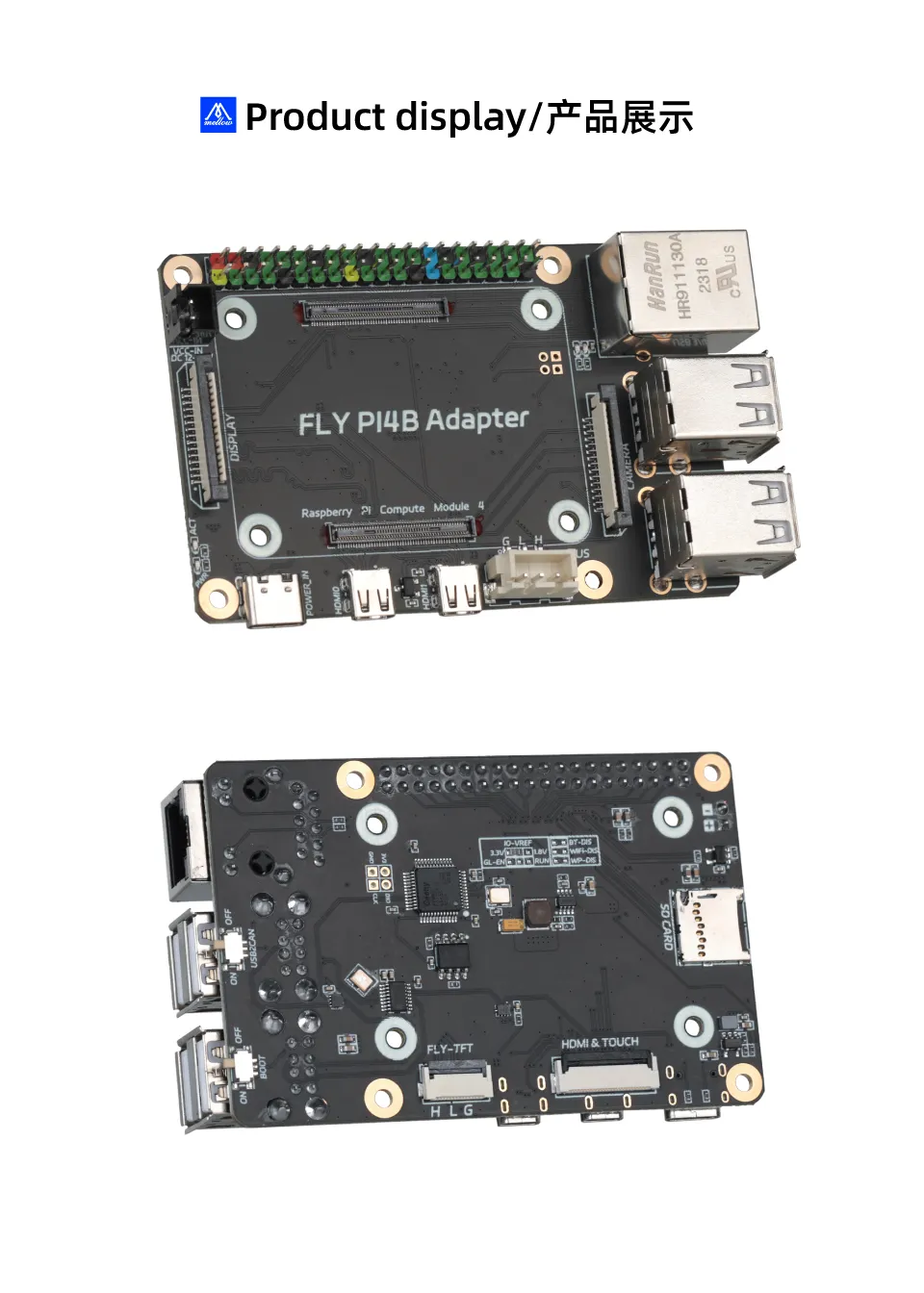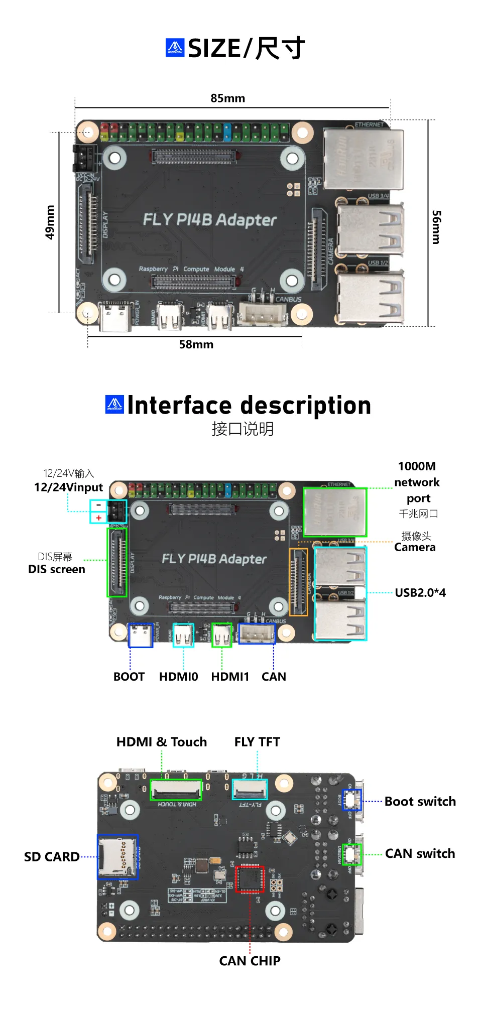上位机类FLY-CM4 扩展板简介本页总览简介 Fly-CM4与树莓派3B和4B完全兼容,并特别针对树莓派CM4拓展改进,这款拓展板提供了一整套专为3D打印机优化的功能。12-24V直流供电确保了供电的稳定性,对3D打印机的精确控制和连续运行至关重要。支持FLY-TFT和Fly-HDMI屏幕FPC连线功能,提供了更方便的走线方式。提供Can端口可以上位机直接Can连接下位机是目前比较流行方式。 特点 支持树莓派CM4核心板 支持12V-24V直流供电 板载UTOC模块 支持TFT与HDMI一线通 支持DSI/spi屏幕接口 支持CSI/USB摄像头接口 40PIN扩展接口,兼容树莓派 产品接口说明