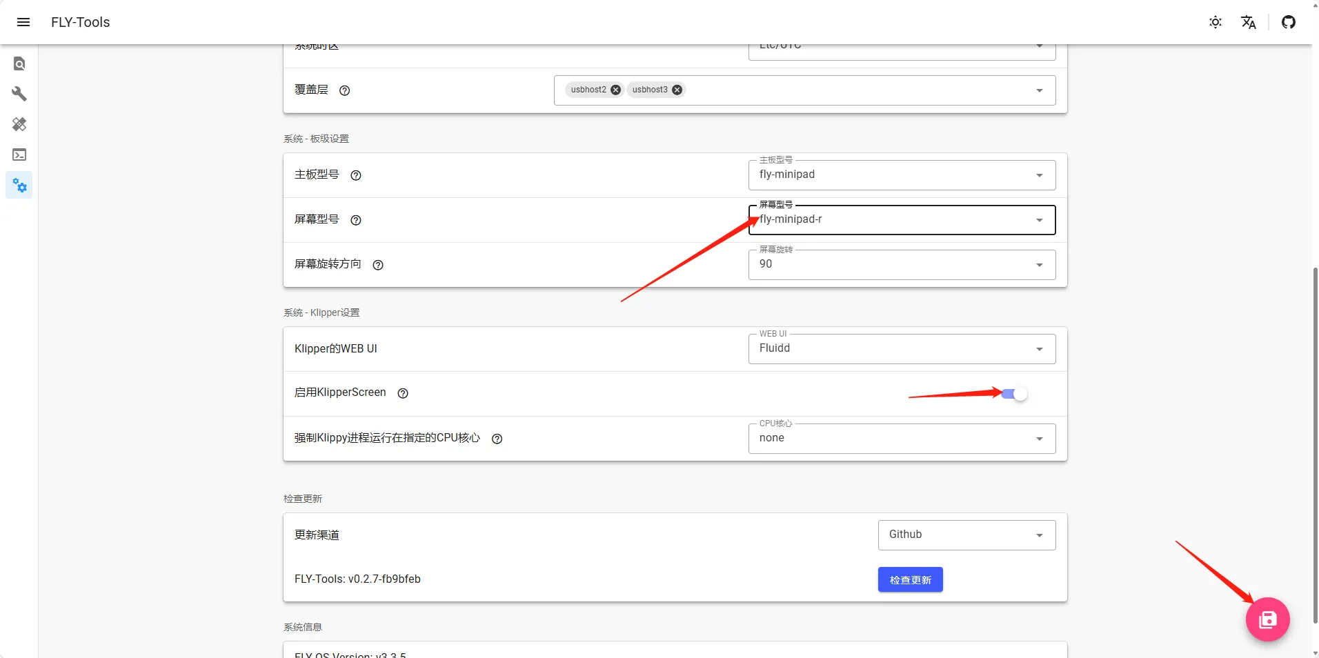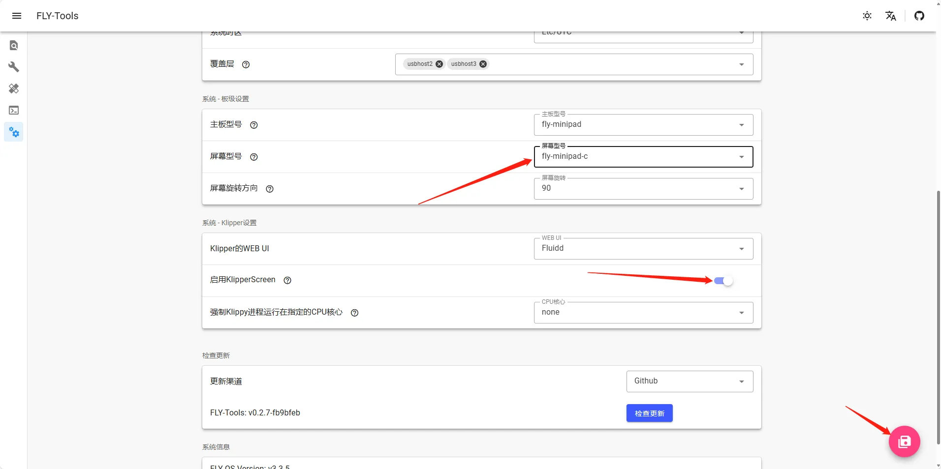• 需要在FLY TOOLS中按下方配置屏幕并且打开KS
