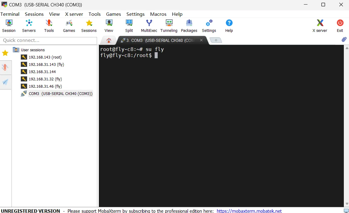 root账户,请输入:su fly,切换到普通用户后,才能进行后续操作!!!