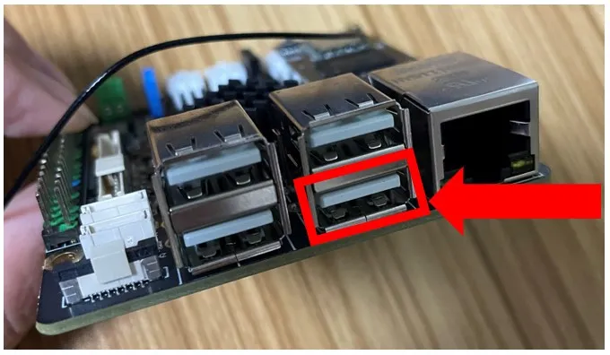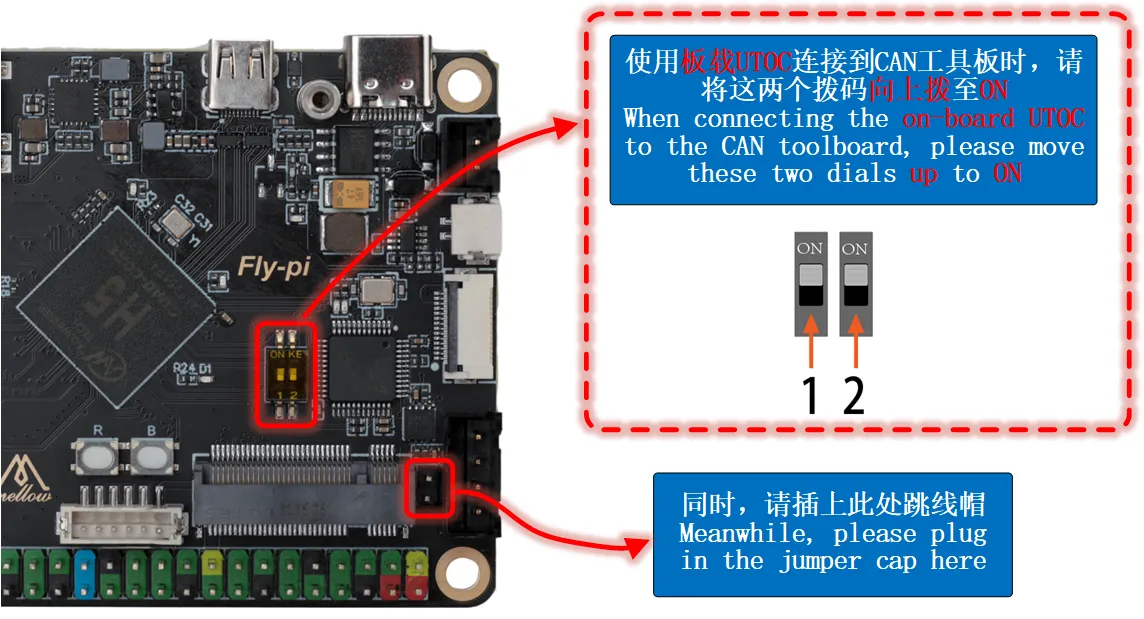 上位机类FLY-Pi-V2板载UTOC使用本页总览板载UTOC使用 打开拨码 打开拨码后将占用一个USB口 提示使用拨码开关启用板载UTOC后,下图所示的USB口会被占用,不能再接入任何设备!!! 接线
