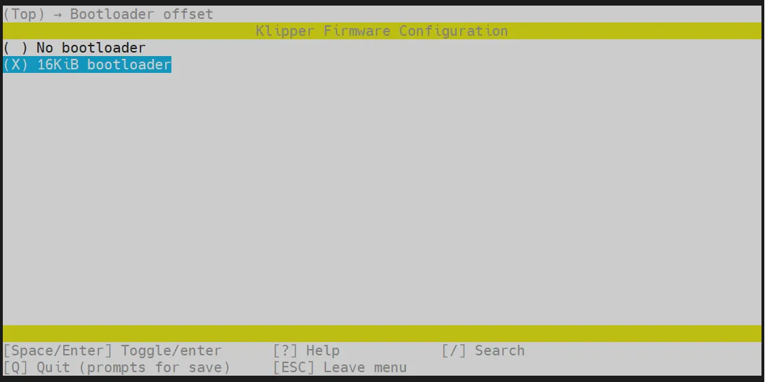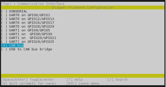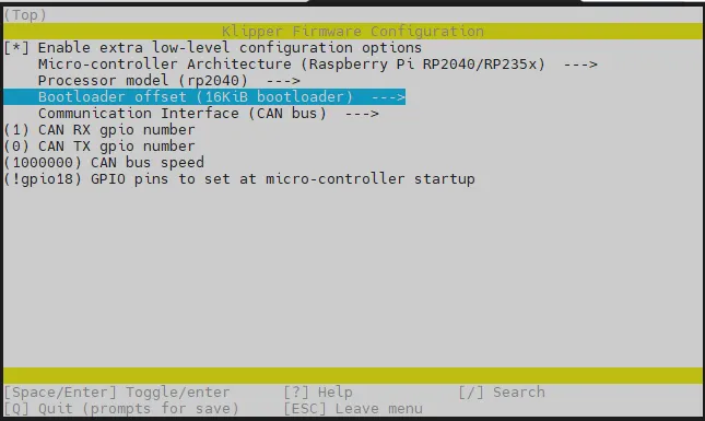 • 其中 rm -rf ~/klipper/.config && rm -rf ~/klipper/out是删除之前编译数据与固件make menuconfig是编译固件,执行后应该出现下方界面