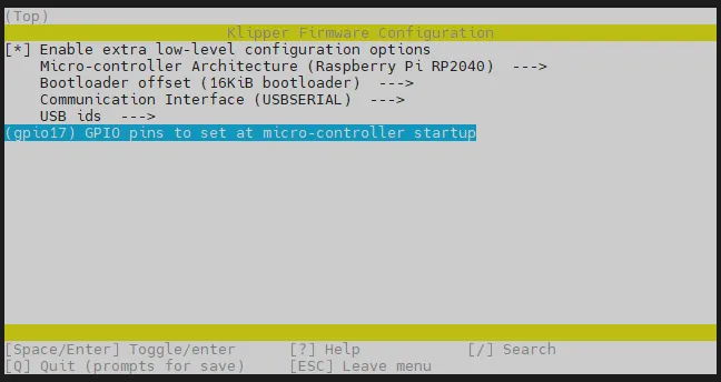 cd ~/klipper && rm -rf ~/klipper/.config && rm -rf ~/klipper/out && make menuconfig -