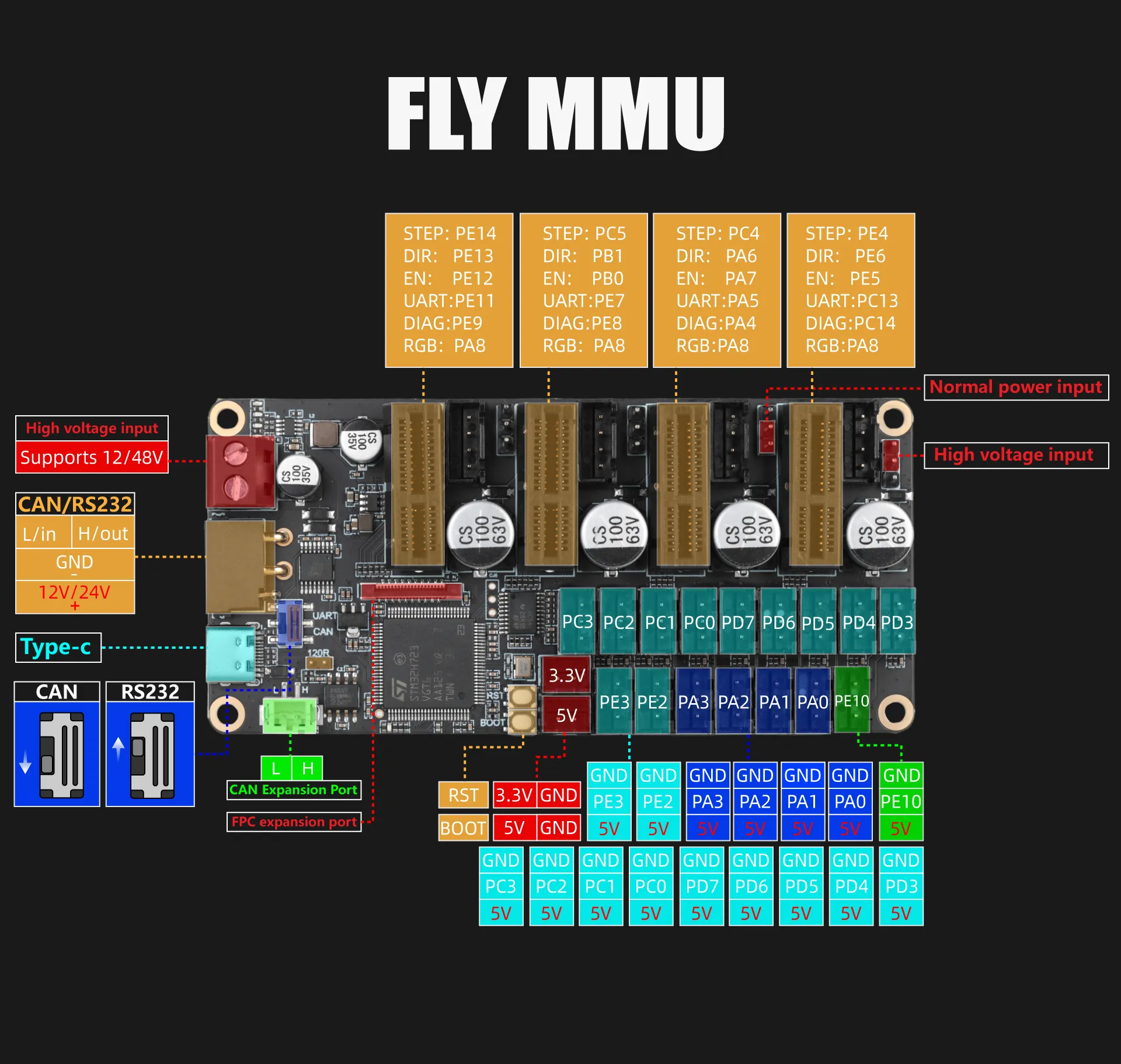 工具板类FLY-MMUFLY-MMU主板接线本页总览主板接线 注意事项由于图片分辨率太高,在网页上浏览无法看清,请将鼠标光标放在接线图上方,单击右键,选择 图片另存为 ,将图片保存到桌面再查看!!! MMU主板PIN图 MMU参考接线