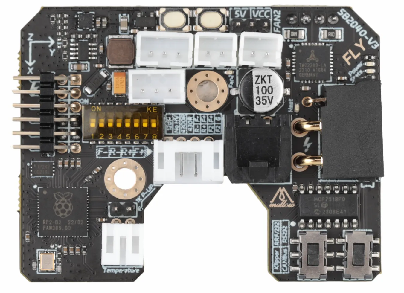 FLY SB2040 V3是广州镁伦电子科技有限公司针对VORON Stealthburber打印头推出的一款工具板,使用该工具板,可以用四根线来替代原来主板与打印头之间繁杂的接线,优化布局。SB2040适用于stealthburner与afterburner,其集成了CAN收发器、RS232收发器、USB口、TMC2209驱动、LIS2DW加速度传感器,三个可控风扇等其他功能的工具板。此工具板适用于Klipper与RRF固件。