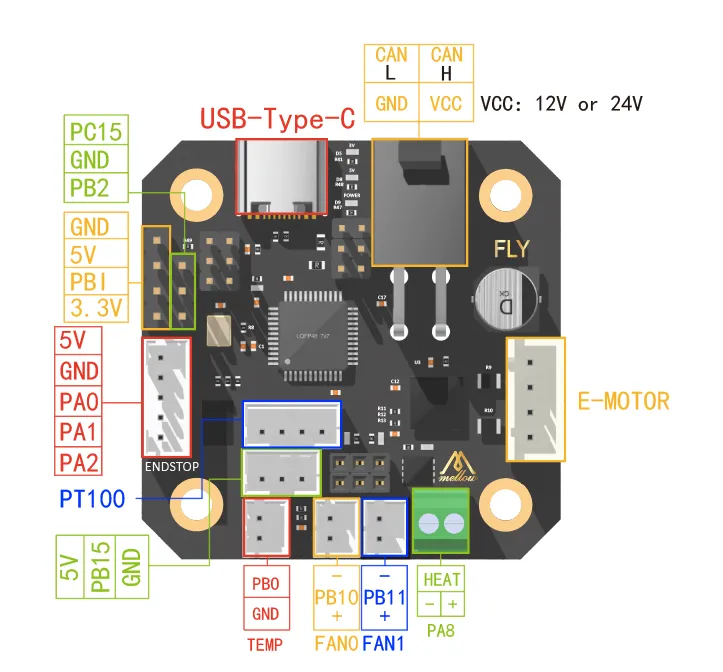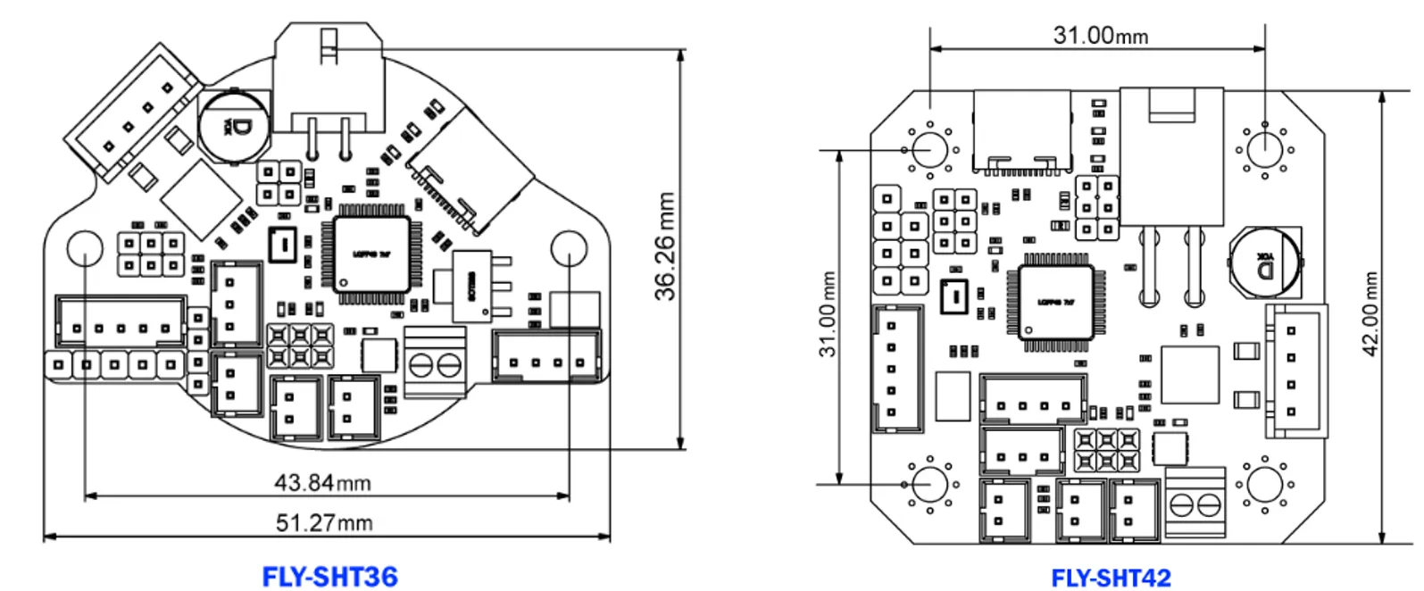FLY SHT36/42是广州镁伦电子科技有限公司针对3D打印机挤出头设计的喷头工具板,使用该工具板,可以用四根线来替代原来主板与打印头之间繁杂的接线,优化布局。SHT36适用于36步进电机,SHT42适用于42步进电机,其集成了CAN收发器、USB口、TMC2209驱动、ADXL345加速度传感器,两个可控风扇等其他功能的工具板。此工具板适用于Klipper固件。