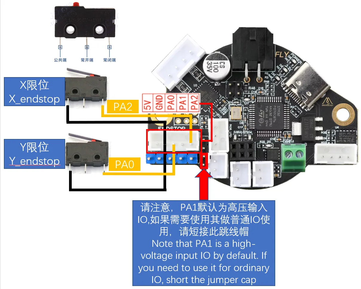 如果为VORON机型,可以考虑更换限位的安装位置,在打印头滑车上安装X限位开关,A电机座上安装Y限位开关。另外,在SHT36上,建议限位开关前最好加上^,将信号上拉。例如: