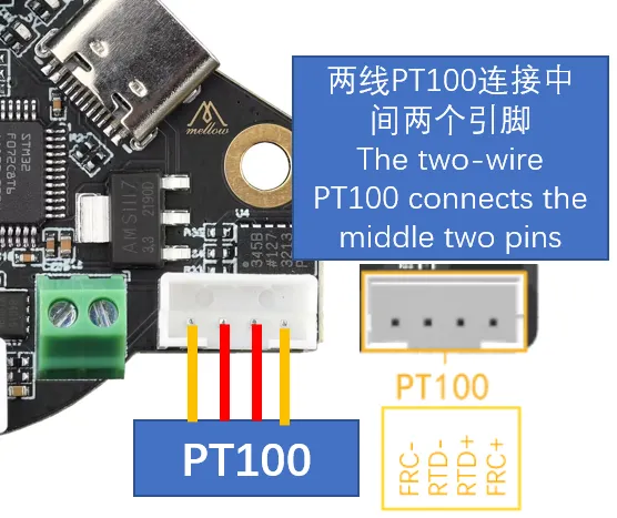 下图为PT100的接线方法。默认两线PT100,只需连接到从左至右第2、3个引脚即可。