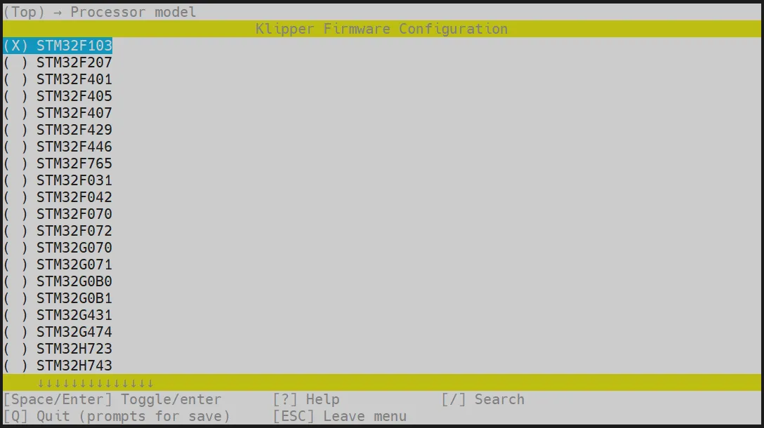 cd ~/klipper && rm -rf ~/klipper/.config && rm -rf ~/klipper/out && make menuconfig -