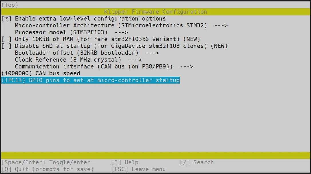 ESC,用于返回上一级菜单 Q键,用于退出Klipper固件配置页面Y键,在退出Klipper固件配置页面时,如果有提示,则点击Y键保存配置文件
