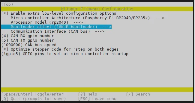 cd ~/klipper && rm -rf ~/klipper/.config && rm -rf ~/klipper/out && make menuconfig -